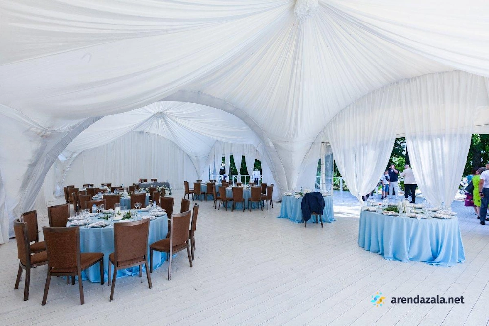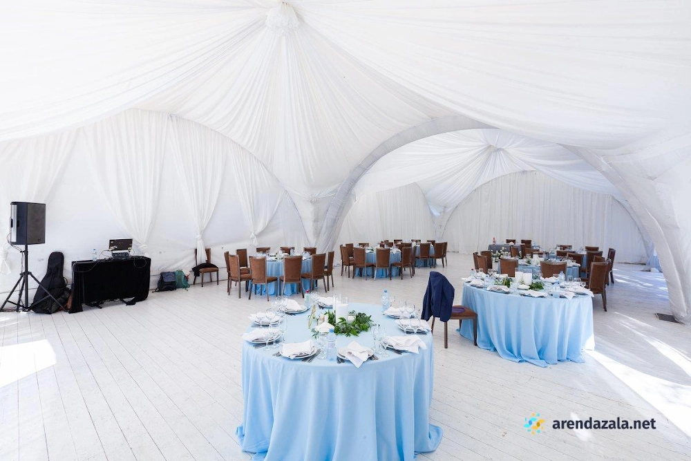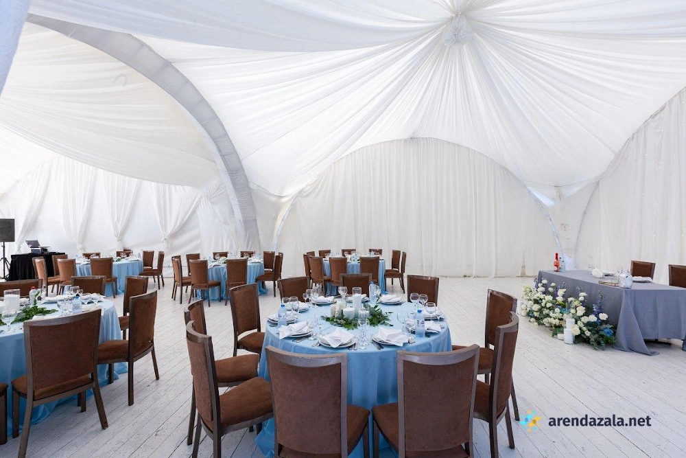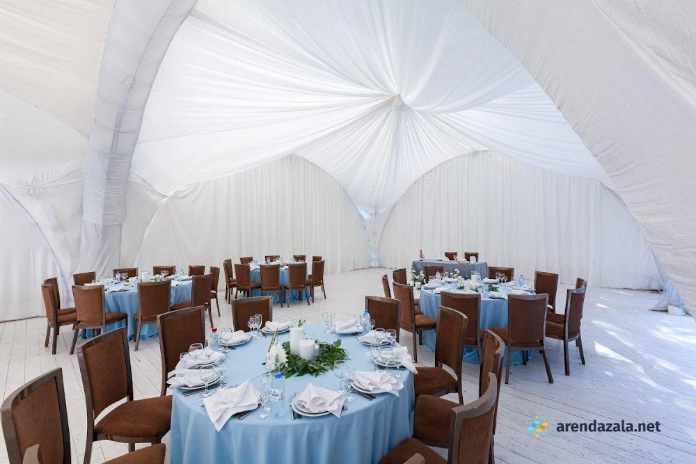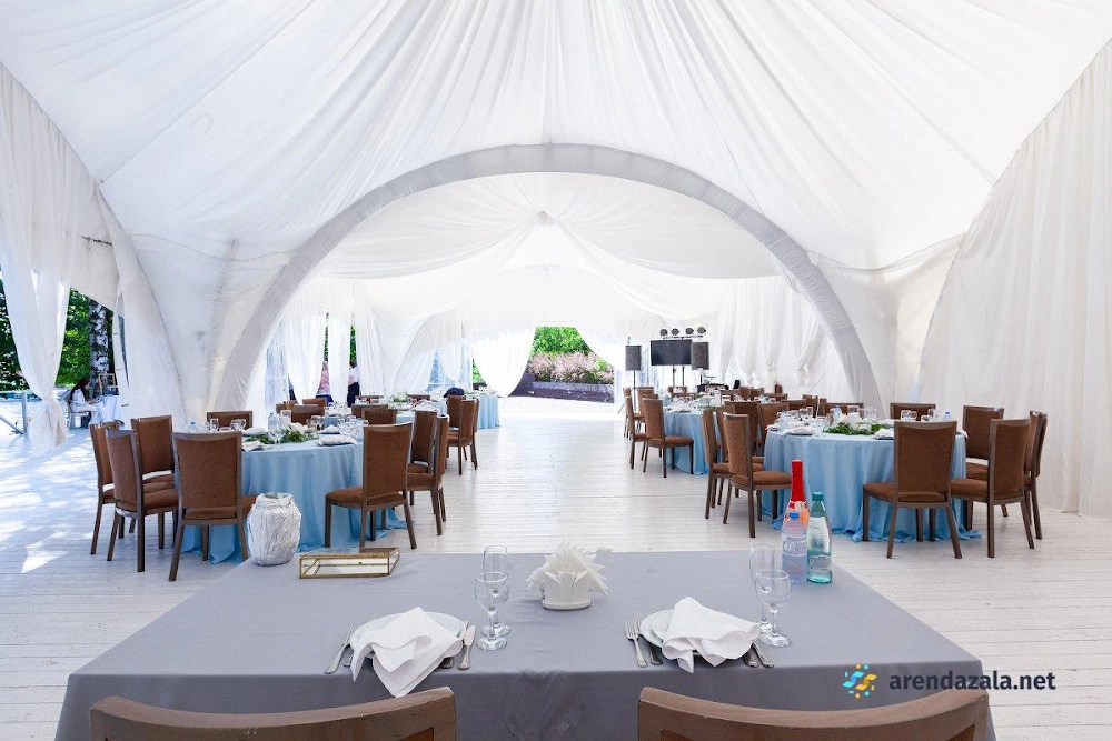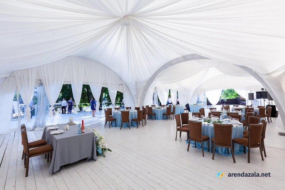 Арочный шатер предлагает гостям уютную атмосферу, где они могут насладиться прекрасным видом на воду и вкусными блюдами. Светлый и просторный зал наполняется мягким сиянием заходящего солнца, создавая неповторимую романтическую обстановку. Профессиональные сотрудники обеспечивают безупречное обслуживание, предлагая фуршетное меню с разнообразными угощениями, которые подаются аккуратными и вежливыми официантами. Заведение идеально подходит для проведения торжественных мероприятий, таких как свадьбы и выпускные вечера, где гости могут почувствовать себя по-особенному.