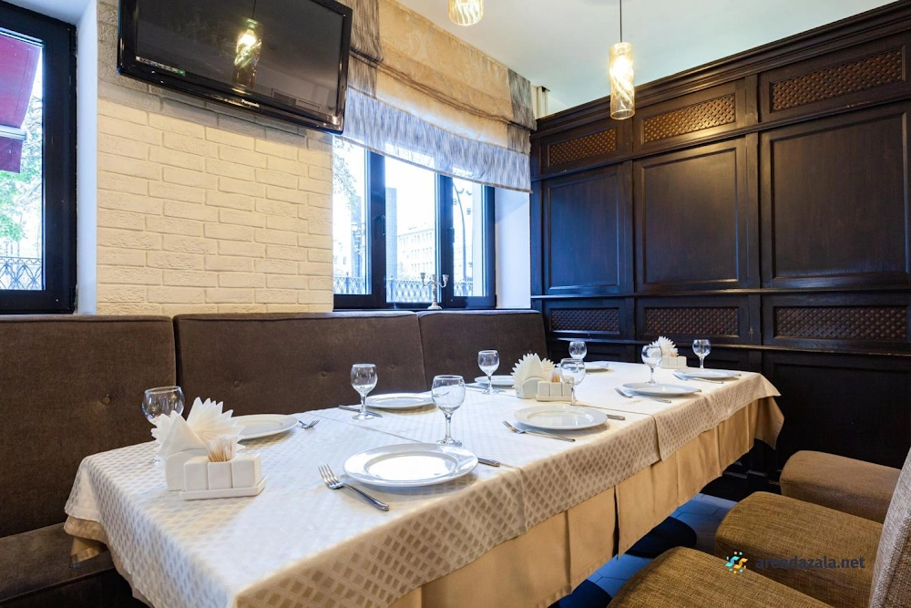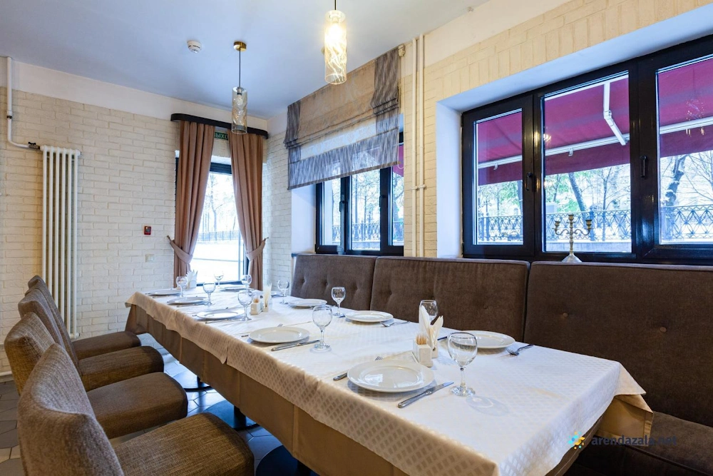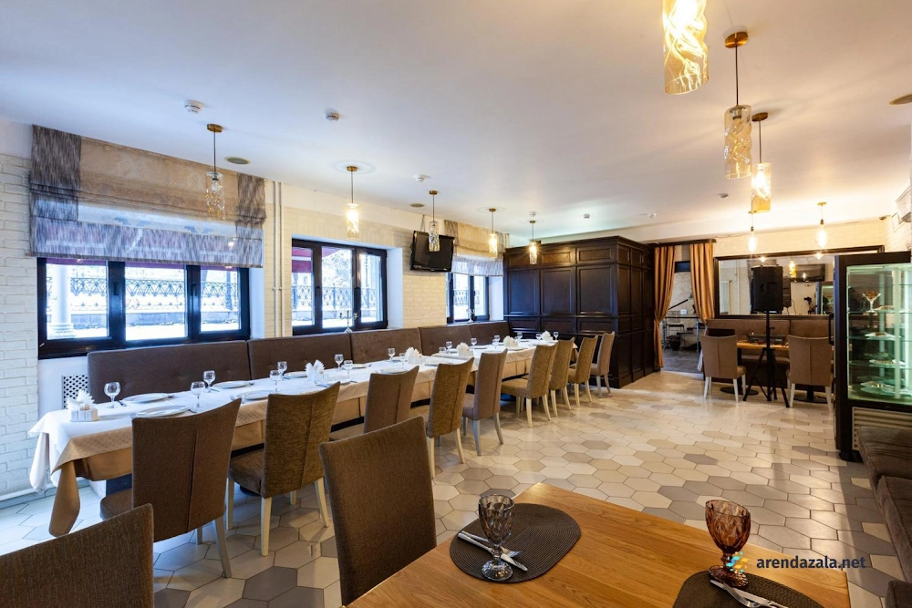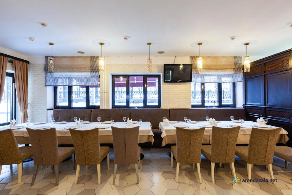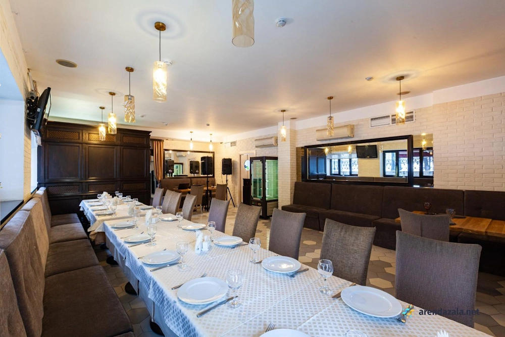 В банкетном зале на 1 этаже подают разнообразные блюда от вкуснейшей баранины на мангале до изысканной семги в соусе «Белое вино». Кухня отличается высоким качеством и разумными ценами, а грамотная подача блюд разгоняет аппетит. Официанты неназойливы, а фоновая музыка не мешает приятному общению за столом. Уютная обстановка и приветливый персонал делают это место привлекательным как для небольших компаний, так и для больших торжеств. Удобное расположение рядом с метро также является преимуществом данного заведения.