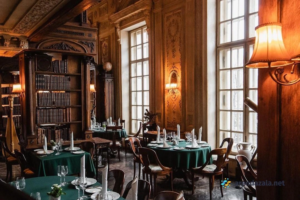 В атмосферном и спокойном зале поражают красотой старинные интерьеры с библиотекой, оранжереей и лифтом, где можно разглядывать великолепные детали аристократического убранства. Приветливый персонал, обращающийся к гостям на «вы», подробно расскажет об истории здания и рекомендует блюда русской кухни - от ухи и мозговых косточек до настоек и десертов с изысканной подачей. Наслаждение доставляют не только богатые вкусы, но и красивое оформление, звуки арфы, создающие уютную атмосферу для культурного времяпрепровождения.